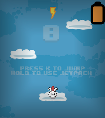 Jump on the clouds in right moment to get more momentum and use jetpack to bust your jumps to get higher.